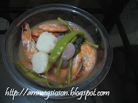When taro is cooked, add the string beans then the sinigang mix and the prawns.
